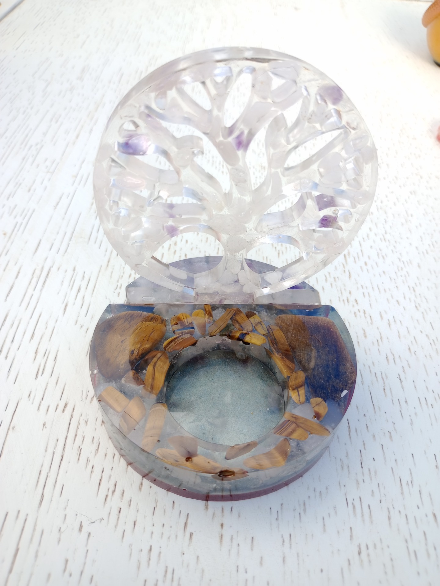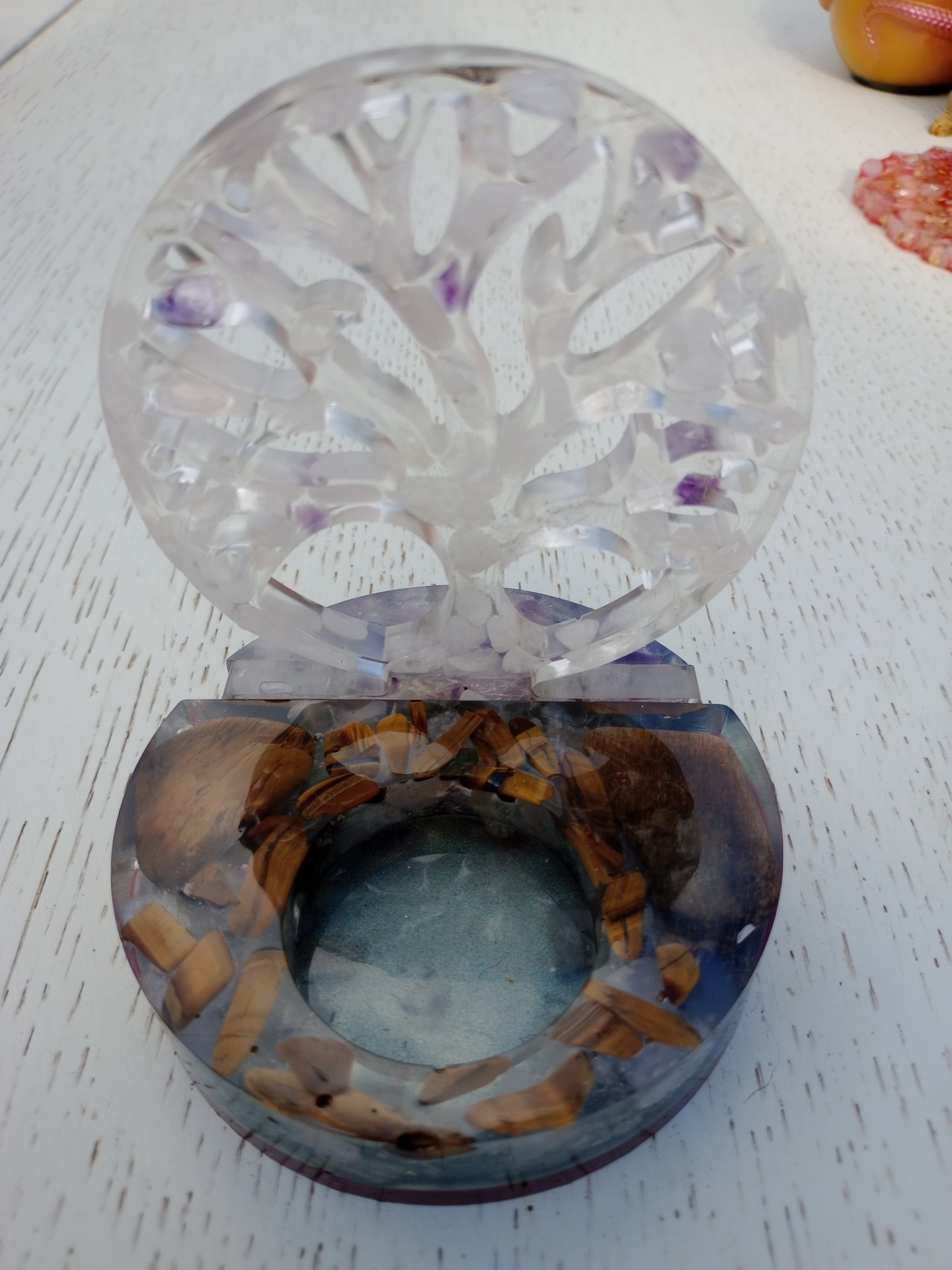Strom života je ověšený křišťály a ametystem pro duchovní podporu.